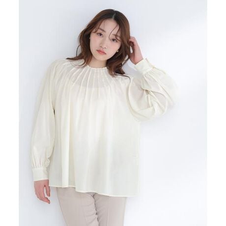 襟ぐりタックがポイントの上品なトップス。首まわりをすっきりと見せながら、顔まわりに程よい華やかさをプラスします。ジャケットインでも映えるデザインは、お仕事シーンにもおすすめ。ボトムス次第でカジュアルにもキレイめスタイルにも着回せます。<素材>シワになりにくいしなやかな素材を使用しています。<詳細>仕様・後ろボタン裏地・なし透け感・ややあり / 光沢・なし / 伸縮性・なし生地の厚さ・薄手※モデルの着用画像の場合、光の当たり具合により、実際の色味と異なって見えることがございます。色味は、商品単体の画像をご参照ください。