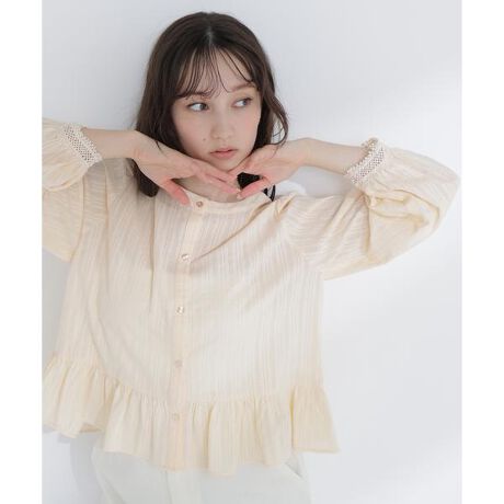 レースカフスデザインがポイントのブラウス。パフスリーブの袖口は華奢なレース素材で切り替え、上品で華やかな雰囲気に見せてくれます。ペプラム切り替えのシルエットがフェミニンさを演出し、ストレートパンツでキレイめにも、デニムでカジュアルダウンも楽しめる着回し力の高い一枚です。<素材>身頃はナチュラルなタッチのドビーストライプ素材を使用。袖口カフスは華奢なレース素材を使用しています。<詳細>仕様・前ボタン裏地・なし透け感・ややあり / 光沢・なし / 伸縮性・なし生地の厚さ・普通 ※モデルの着用画像の場合、光の当たり具合により、実際の色味と異なって見えることがございます。色味は、商品単体の画像をご参照ください。