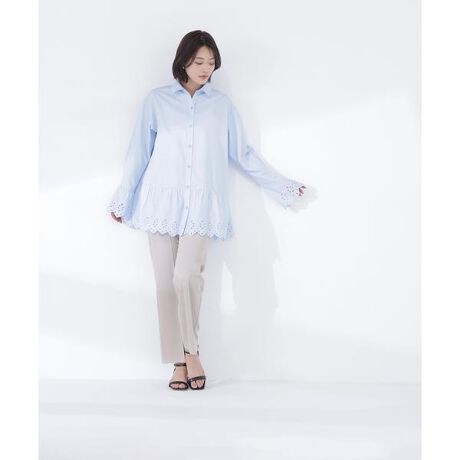 程よい広がりのあるセミフレアシルエットが、脚のラインをキレイに見せるツイルパンツ。センタープレスで縦ラインを強調し、スタイルアップ効果を期待できます。後ろウエストはゴム仕様で、見た目のきちんと感と快適なはき心地を両立。着丈の長いトップスやペプラムアイテムとのコーディネートがおすすめです。<素材>程よくハリのあるとろみツイル素材を使用しています。<詳細>仕様・前ファスナー裏地・なし透け感・なし / 光沢・なし / 伸縮性・なし生地の厚さ・普通※モデルの着用画像の場合、光の当たり具合により、実際の色味と異なって見えることがございます。色味は、商品単体の画像をご参照ください。