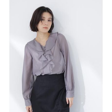 フロントのラッフルフリルがポイントの華やかなブラウス。袖山と袖口にギャザーをあしらった女性らしいスリーブデザインです。スカートでもパンツでも合わせやすく、コーディネートの幅が広がります。<素材>程よい透け感と光沢感のあるシアー素材を使用しています。<詳細>仕様・前ボタン裏地・なし透け感・ややあり / 光沢・ややあり / 伸縮性・なし生地の厚さ・薄手 ※モデルの着用画像の場合、光の当たり具合により、実際の色味と異なって見えることがございます。色味は、商品単体の画像をご参照ください。