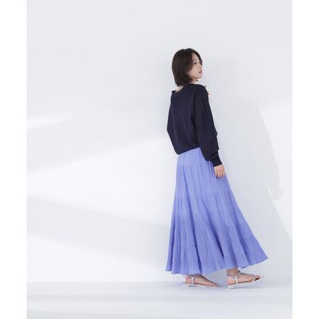 凹凸のある生地感が、シンプルなトップスと合わせても着映えするロングスカート。ティアード切り替えがふんわりとしたボリューム感を生み、女性らしいシルエットを演出します。ロング丈ながらも軽やかで、動くたびに揺れるニュアンスがシーズンムードを高めてくれます。<素材>表情のある楊柳素材を使用しています。<詳細>仕様・開閉なし裏地・あり透け感・ややあり / 光沢・なし / 伸縮性・なし生地の厚さ・薄手※モデルの着用画像の場合、光の当たり具合により、実際の色味と異なって見えることがございます。色味は、商品単体の画像をご参照ください。