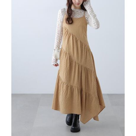 春先から盛夏まで着られる、リラックス感のあるキャミワンピース。斜めに入れたティアードとアシンメトリーな裾が特徴で、全体がらせん状風の新しいデザインがポイントです。バストまわりはゆとりがあり、ロンTやハイゲージニットなどのインナー合わせも可能。裾の一番長い部分でも引きずらない着丈になっています。柔らかくナチュラルな風合いのコットン混の小チェック柄を使用。盛夏は一枚でも着用いただけます。インナーにシアー天竺ラグラン長袖カットソー(ブランド品番131-6160219)と合わせたり、パーカーを羽織ったスニーカースタイルもおすすめです。※モデルの着用画像の場合、光の当たり具合により、実際の色味と異なって見えることがございます。色味は、商品単体の画像をご参照ください。