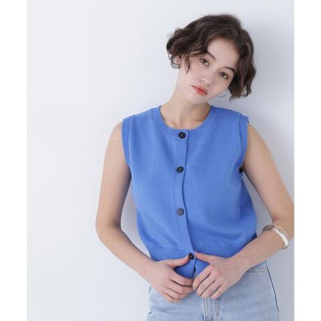 コンパクトなシルエットで着回しやすいニットベスト。薄手のカットソーやシャツとのレイヤードはもちろん、一枚でさらっと着ても決まるデザインです。配色ボタンがアクセントになり、シンプルながら存在感のあるスタイリングが完成します。<素材>ラフでカジュアルな印象の糸を使用しています。<詳細>仕様・前ボタン裏地・なし透け感・なし / 光沢・なし / 伸縮性・なし生地の厚さ・普通 ※モデルの着用画像の場合、光の当たり具合により、実際の色味と異なって見えることがございます。色味は、商品単体の画像をご参照ください。