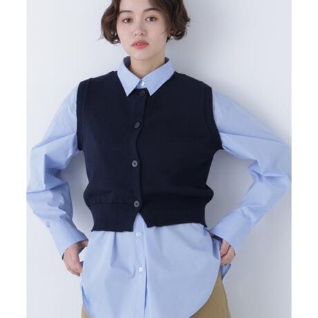 コンパクトなシルエットで着回しやすいニットベスト。薄手のカットソーやシャツとのレイヤードはもちろん、一枚でさらっと着ても決まるデザインです。配色ボタンがアクセントになり、シンプルながら存在感のあるスタイリングが完成します。<素材>ラフでカジュアルな印象の糸を使用しています。<詳細>仕様・前ボタン裏地・なし透け感・なし / 光沢・なし / 伸縮性・なし生地の厚さ・普通 ※モデルの着用画像の場合、光の当たり具合により、実際の色味と異なって見えることがございます。色味は、商品単体の画像をご参照ください。