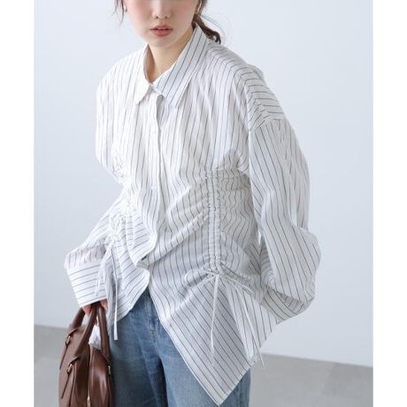柔らかくごわつきのないコットン混素材を使用したオーバーシャツ。くたっとした肌触りで心地よく、厚手すぎないので羽織りとしても、アウターやカーディガンのインナーとしても活躍します。オーバーサイズのシルエットに、前裾の長さを調節できるドロストデザインをプラス。ドロスト調節で前裾の着丈が上がり、パンツ合わせでスタイルアップを期待できます。パンツはもちろん、ミニスカートやショートパンツともバランス良く着用いただけます。※モデルの着用画像の場合、光の当たり具合により、実際の色味と異なって見えることがございます。色味は、商品単体の画像をご参照ください。