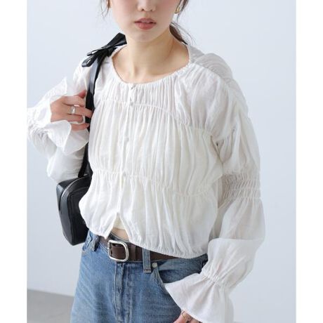 シアーギャザー前開き短丈ブラウス