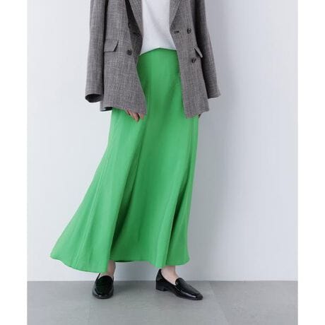 裾に向かって広がるフレアシルエットがキレイなスカート。やや透け感のあるシワ感素材を使用し、フラットになりすぎず程よいカジュアル感を演出します。ウエストまわりはすっきりとしたデザインで、コンパクトなニットやボリュームトップスをアウトで合わせるスタイリングがおすすめ。後ろウエストは一部分ゴム仕様で程よいフィット感があります。春夏らしいスタイルに見せてくれる鮮やかなグリーンカラーを揃えています。<素材>やや透け感のあるシワ感が特徴的な素材を使用しています。<詳細>仕様・左ファスナー裏地・あり透け感・ややあり / 光沢・ややあり / 伸縮性・なし生地の厚さ・薄手※モデルの着用画像の場合、光の当たり具合により、実際の色味と異なって見えることがございます。色味は、商品単体の画像をご参照ください。