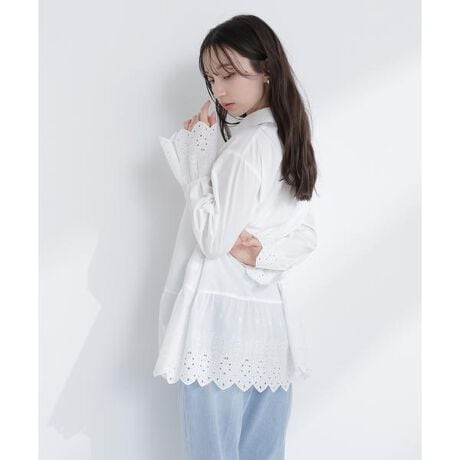 袖と裾のレース柄刺しゅうが、シンプルなデザインに華やかなアクセントを加えてくれるシャツ。程よくゆとりのあるオーバーシルエットで、こなれた印象に見せてくれます。ニットやジャケットのインに合わせると、レース部分がさりげなくのぞくレイヤードスタイルも楽しめます。<素材>整った表面の綿タッチのシャツ素材を使用しています。<詳細>仕様・前ボタン裏地・なし透け感・なし / 光沢・なし / 伸縮性・なし生地の厚さ・普通※モデルの着用画像の場合、光の当たり具合により、実際の色味と異なって見えることがございます。色味は、商品単体の画像をご参照ください。