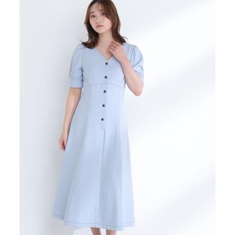 配色ステッチとボタンがアクセントになった上品なワンピース。Vネックデザインが顔まわりをすっきりと見せてくれます。後ろウエストはゴム仕様で、腰まわりがキレイに収まるシルエット。お仕事シーンにも活躍してくれる、きちんと感のある一枚です。<素材>程よい落ち感としなやかさを備えた素材を使用。キレイなシルエットを保ち、上品な印象で着られる素材です。<詳細>仕様・前ボタン裏地・あり透け感・なし / 光沢・なし / 伸縮性・なし生地の厚さ・普通※モデルの着用画像の場合、光の当たり具合により、実際の色味と異なって見えることがございます。色味は、商品単体の画像をご参照ください。