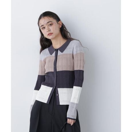 今シーズンらしい襟付きデザインとマルチカラーが新鮮なコンパクトリブニット。変形リブ編みにアイレットを入れ、軽やかで表情のある印象のデザインです。本開きボタン仕様で、プルオーバーとしてもカーディガンとしても着ていただけます。<素材>さらっとややドライタッチなポリエステル混素材を使用しています。<詳細>仕様・前ボタン裏地・なし透け感・ややあり / 光沢・なし / 伸縮性・あり生地の厚さ・普通 ※モデルの着用画像の場合、光の当たり具合により、実際の色味と異なって見えることがございます。色味は、商品単体の画像をご参照ください。