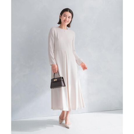 スカート部分におおきく入れたタックで、美しいシルエットを実現。袖部分は、肌が透けない濃さのシフォンを使用しています。