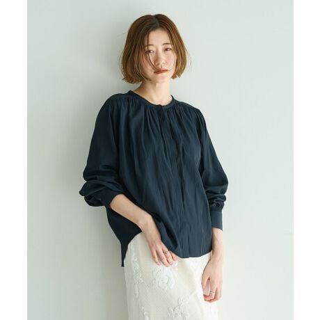 繊細なギャザーが生み出す柔らかな陰影が、装いに奥行きを与える一枚です。