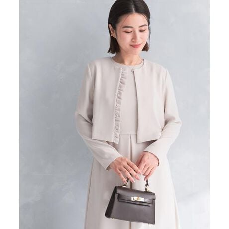 ワンピースに合う少し短め着丈のジャケット。片側につけたフリルもさりげなく、フォーマルワンピースの羽織として活躍します。卒園式や入学式などのセレモニーシーンにもおすすめです。
