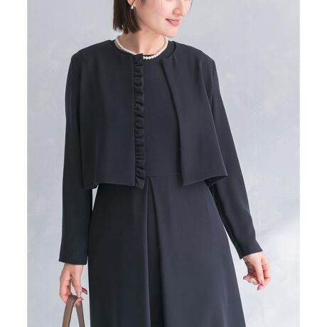 ワンピースに合う少し短め着丈のジャケット。片側につけたフリルもさりげなく、フォーマルワンピースの羽織として活躍します。卒園式や入学式などのセレモニーシーンにもおすすめです。
