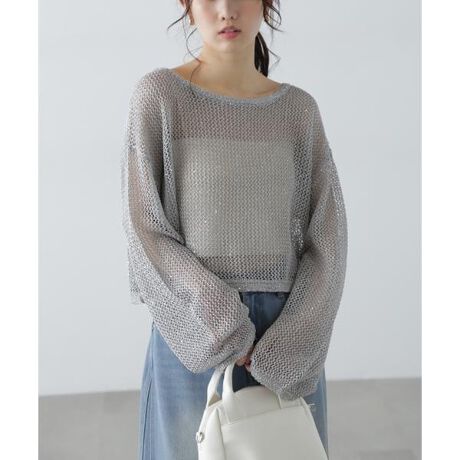 光沢のあるカラッとしたメッシュ編みに、小さ目なスパンコールでシャイニーさをミックスしたニット。シンプルながらも華やかな一枚です。ゆとりがある身頃はルーズな抜け感がでて、リラクシーな着こなしを楽しめます。シアーインナーや薄手のニットカットソーとのレイヤードスタイルや、カップ付きベアキャミソールと合わせたヘルシーな肌見せコーデもおすすめです。※モデルの着用画像の場合、光の当たり具合により、実際の色味と異なって見えることがございます。色味は、商品単体の画像をご参照ください。
