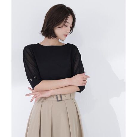袖をシアーな編地で切り替えた、女性らしく軽やかな印象と抜け感を演出してくれるデザインニット。袖口カフスにあしらった金属ハトメがさりげないアクセントになり、一枚で着映えします。デイリーはもちろん、通勤などのキレイめスタイルにも取り入れやすいアイテムです。<素材>身頃はキレイなハイゲージ天竺素材、袖はシアーな天竺編地を使用しています。<詳細>仕様・開閉なし裏地・なし透け感・ややあり / 光沢・なし / 伸縮性・あり生地の厚さ・普通※モデルの着用画像の場合、光の当たり具合により、実際の色味と異なって見えることがございます。色味は、商品単体の画像をご参照ください。