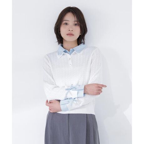 シャツをドッキングしたケーブル編みニット。カフスの華奢なリボンが女性らしいアクセントになり、ダブルカラーのスキッパーデザインで首元に抜け感をプラス。一枚でレイヤード風の着こなしが楽しめます。<素材>ニット部分はすっきりとしたハイゲージニット、シャツ部分は布帛シャツ素材を使用しています。<詳細>仕様・前ボタン裏地・なし透け感・なし / 光沢・なし / 伸縮性・あり生地の厚さ・普通※モデルの着用画像の場合、光の当たり具合により、実際の色味と異なって見えることがございます。色味は、商品単体の画像をご参照ください。