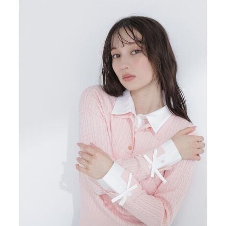 シャツをドッキングしたケーブル編みニット。カフスの華奢なリボンが女性らしいアクセントになり、ダブルカラーのスキッパーデザインで首元に抜け感をプラス。一枚でレイヤード風の着こなしが楽しめます。<素材>ニット部分はすっきりとしたハイゲージニット、シャツ部分は布帛シャツ素材を使用しています。<詳細>仕様・前ボタン裏地・なし透け感・なし / 光沢・なし / 伸縮性・あり生地の厚さ・普通※モデルの着用画像の場合、光の当たり具合により、実際の色味と異なって見えることがございます。色味は、商品単体の画像をご参照ください。