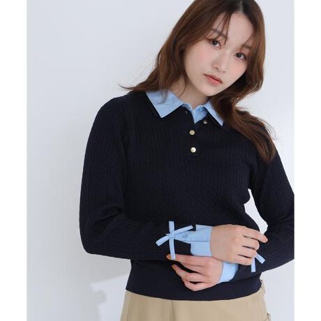 シャツをドッキングしたケーブル編みニット。カフスの華奢なリボンが女性らしいアクセントになり、ダブルカラーのスキッパーデザインで首元に抜け感をプラス。一枚でレイヤード風の着こなしが楽しめます。<素材>ニット部分はすっきりとしたハイゲージニット、シャツ部分は布帛シャツ素材を使用しています。<詳細>仕様・前ボタン裏地・なし透け感・なし / 光沢・なし / 伸縮性・あり生地の厚さ・普通※モデルの着用画像の場合、光の当たり具合により、実際の色味と異なって見えることがございます。色味は、商品単体の画像をご参照ください。