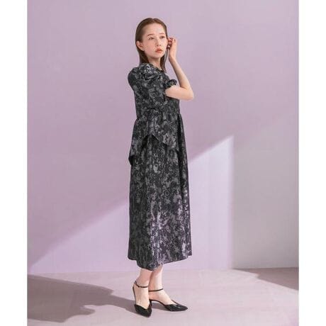 光沢糸を織り交ぜた上品で華やかさのあるジャカード素材を使用し、ガーリーな気分を満たしてくれるボリュームドレスが登場。ギャザーをたっぷり寄せてつくったパフスリーブや、アシンメトリーなフリルがキャッチーな印象に。着映えする華やかなディティールをちりばめました。スカート部分はウエストにボリュームを持たせつつ、ストンと落ちるシルエット。更にくるぶしが見えるスッキリとしたレングスで、甘さの中にも大人のひき算を効かせた丁度よいバランスのデザインです。