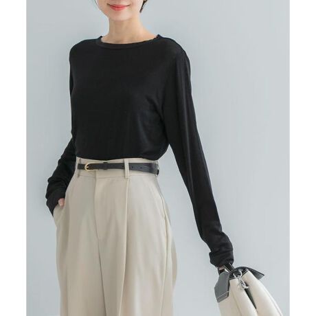 驚くほど軽やかで繊細な質感は、肌に優しく馴染み、春先の柔らかな日差しに美しく映える清涼感のある一枚に。 ほんのりと素肌がのぞくことで、いつもの装いに洗練された抜け感を与えてくれます。首元はベーシックなクルーネックで、どんなボトムスとも好相性。 長めの袖丈が手元にニュアンスを作り、所作まで美しく見せてくれます。一枚で着るのはもちろん、ジャケットやカーディガンのインナーとしても優秀。 ハイウエストのパンツにインすれば、スタイルアップした知的な着こなしに。 デニムと合わせたカジュアルな装いも、シアーな質感のおかげで大人っぽく仕上がります。
