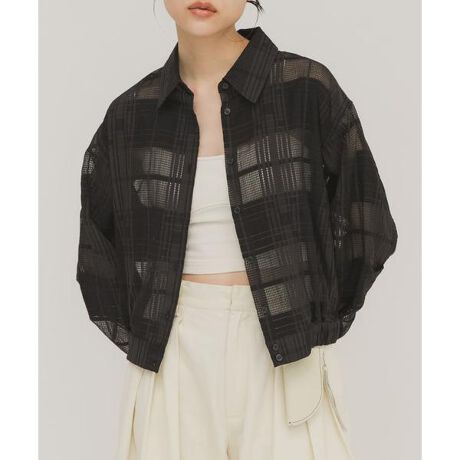 ワードローブの定番チェック柄を使用したコンパクトなシャツが登場。メンズライクさのあるデザインながらも、軽やかな透け感が女性らしさを引き上げ、凹凸のある柄は華やかさも演出します。ウエストゴムが設定されており、腰で留まるようなサイジングはブルゾンのようなシルエットになるところもポイントです。