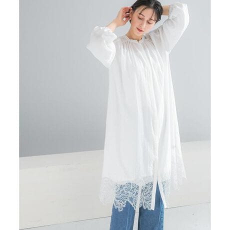 トレンドのレースを刺繍風に繋ぎ合わせたこだわりの仕様が、華やかで奥行きのある表情を演出。 甘さを抑えたレース柄を選ぶことで、シックで洗練された大人の佇まいに仕上げました。袖口はゴム仕様になっており、気温やシーンに合わせて袖丈を自在に調整できるのも嬉しいポイント。 ふんわりと空気を孕むシルエットが、動くたびに優雅な揺れを生み出し、知的な女性らしさを引き立てます。一枚でワンピースとして纏うのはもちろん、前を開けてパンツスタイルにさらりと羽織る着こなしもおすすめ。 デニムやスラックスに重ねるだけで、いつもの装いがぐっと鮮度の高いレイヤードスタイルに変わります。