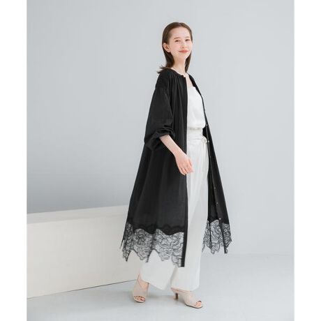 トレンドのレースを刺繍風に繋ぎ合わせたこだわりの仕様が、華やかで奥行きのある表情を演出。 甘さを抑えたレース柄を選ぶことで、シックで洗練された大人の佇まいに仕上げました。袖口はゴム仕様になっており、気温やシーンに合わせて袖丈を自在に調整できるのも嬉しいポイント。 ふんわりと空気を孕むシルエットが、動くたびに優雅な揺れを生み出し、知的な女性らしさを引き立てます。一枚でワンピースとして纏うのはもちろん、前を開けてパンツスタイルにさらりと羽織る着こなしもおすすめ。 デニムやスラックスに重ねるだけで、いつもの装いがぐっと鮮度の高いレイヤードスタイルに変わります。