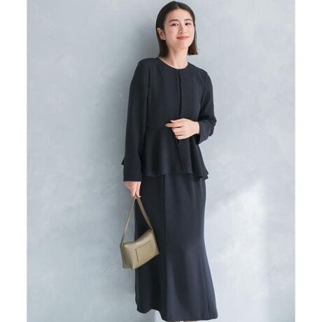 セットアップのように見えながらも、ジャケットとワンピースがつながっているため、着用中の着崩れを防ぎ美しいシルエットをキープ。ワンピース部分はマーメイドシルエットでウエストが過度にタイトにならないよう設計し、ジャケットのかっちりとした印象を保ちつつ、快適にご着用いただけるデザインに仕上げました。