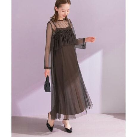 繊細なハリ感と自然な落ち感のあるチュールが、空気を含んだような美しい揺れを演出してくれるドレスが登場。 ボリュームを持たせたシルエットながら、素材の透明感によって重くならず、華やかな印象を与えてくれます。付属のチュールビスチェを重ねれば、特別な日にふさわしい奥行きのある装いに。 インナーワンピースは一枚でも着用可能なキャミソールタイプで、シーンに合わせた着こなしが広がります。 日常のスタイルにチュールのエッセンスを加えることで、知的な遊び心のあるドレスアップを叶えます。チュールビスチェをお手持ちのカットソーに重ねて、カジュアルな装いをアップデートするのもおすすめ。 ワンピースの下にデニムを合わせたレイヤードスタイルなら、こなれたデイリースタイルが完成します。 キャミワンピースにシャツをさらりと羽織るなど、アイデア次第で多彩な表情を楽しめる一着。