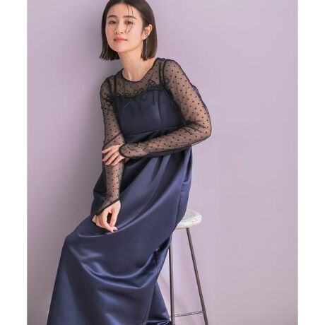 透け感のあるシアーチュールに、ふんわりと浮かぶフロッキードットをあしらったフェミニントップス。バックには深めに入ったスリットとテープデザインを取り入れ、抜け感のある後ろ姿を演出。さらに、手の甲までかかる長めの袖口が、モードなアクセントになっています。シアーな透け感を活かして、オールインワンやキャミワンピースのインナーとして重ねたり、デニムに合わせてカジュアルダウンしたりと、幅広いコーディネートが楽しめる一枚です。