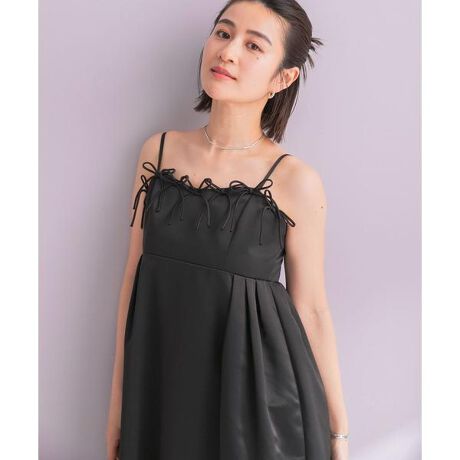 ハリと光沢を兼ね備えた上質な生地を使用し、理想のフォルムを追求するために何度も試作を重ねたこだわりのドレス。トップにあしらった大きなリボンが視線を惹きつけ、存在感のあるスタイルに。高めに設定したウエストラインはスタイルアップと脚長効果を叶え、短めの着丈がガーリーな印象をプラス。ふんわり広がるボリュームスカートは、気になる部分をさりげなくカバーしてくれるのも嬉しいポイントです。ネイビーのみ配色リボンで、ブラック×ネイビーのコントラストがガーリーモードな雰囲気を演出。