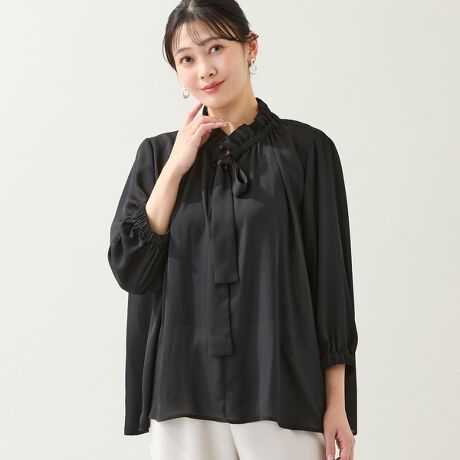襟ぐりにギャザーたっぷりと寄せたボウタイのデザイン。タイは結んだり、ラフに垂らして着ても素敵です。