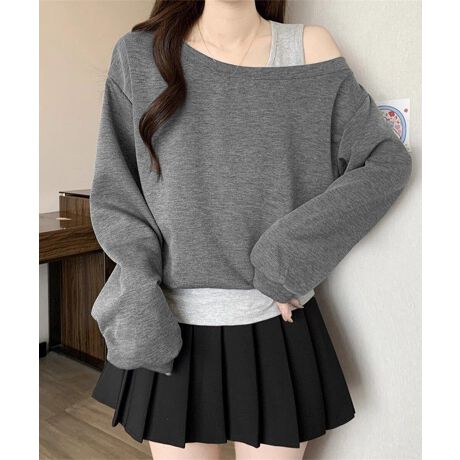ゆったりとしたシルエットとオフショルダーデザインが特徴のレイヤード風スウェット。