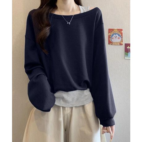 ゆったりとしたシルエットとオフショルダーデザインが特徴のレイヤード風スウェット。
