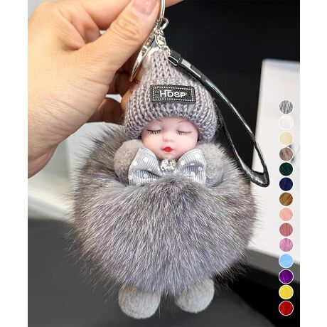 ニット帽をかぶったドールとふわふわのファーが特徴の、バッグやキーに付けられるぶら下げチャーム。