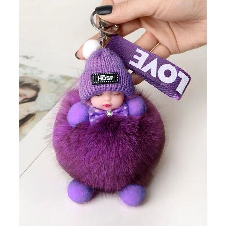 ニット帽をかぶったドールとふわふわのファーが特徴の、バッグやキーに付けられるぶら下げチャーム。