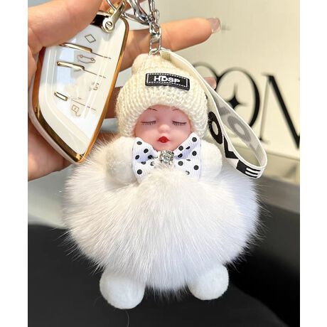 ニット帽をかぶったドールとふわふわのファーが特徴の、バッグやキーに付けられるぶら下げチャーム。