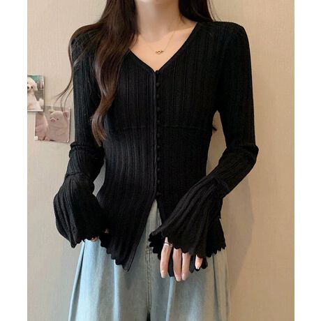 ほどよく広がるフレアスリーブと縦ラインの編地が、女性らしい柔らかな印象を演出。