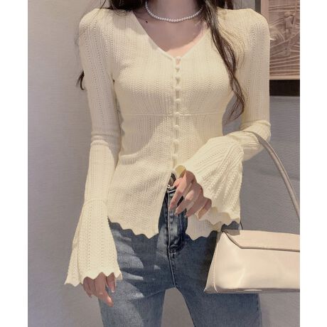 ほどよく広がるフレアスリーブと縦ラインの編地が、女性らしい柔らかな印象を演出。