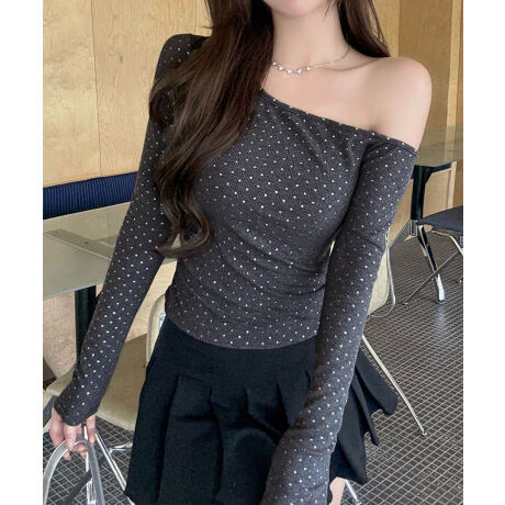 きらめくラメをあしらった、アシンメトリーなネックラインの長袖Tシャツ。