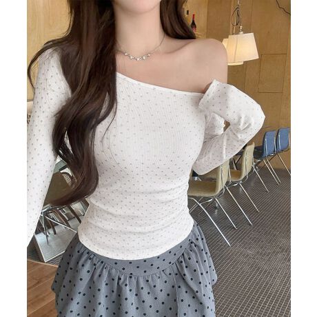 きらめくラメをあしらった、アシンメトリーなネックラインの長袖Tシャツ。