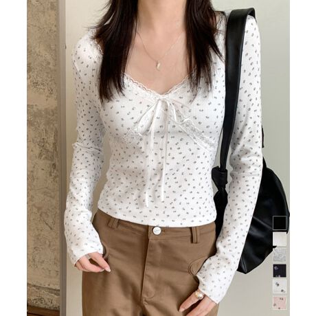 胸元のリボンとレースがポイントの、フィット感抜群なVネック長袖トップス。