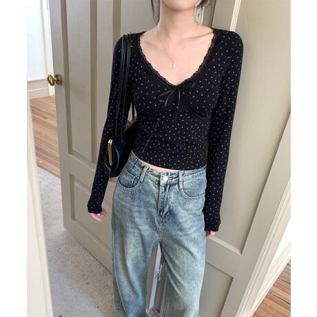 胸元のリボンとレースがポイントの、フィット感抜群なVネック長袖トップス。