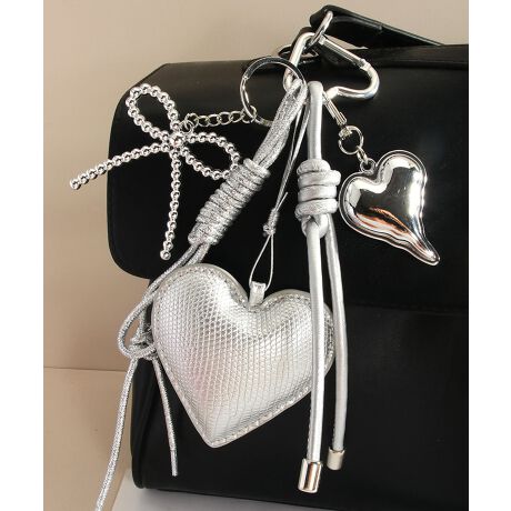オールシルバーのハートチャーム、パラコード、ビーズチェーンがセットになった、マルチユース対応のバッグチャーム。