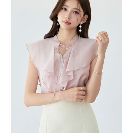 フリルビッグカラーが女性らしいノースリーブブラウス。