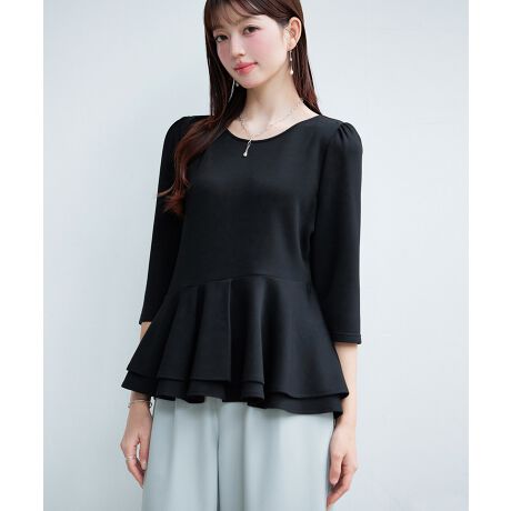 裾部分は、二段フリルのペプラムデザインです。フロント部分だけアシンメトリーになったデザインが ちょっとしたこなれ感をプラスして一枚で着映えます。二段のフリルも華やかです。クルーネックで首元すっきり。