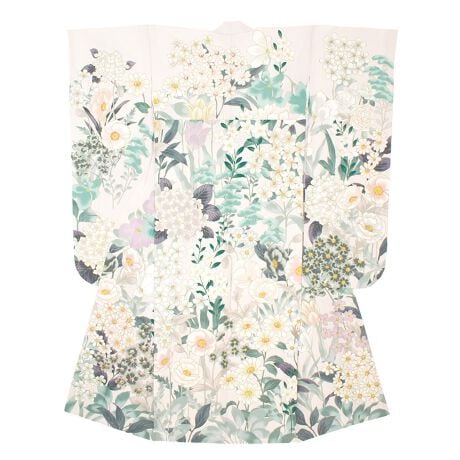 紫陽花やポピーにガーベラ、桔梗に牡丹や菊などの華やかな花々が散りばめられたデザインです。
