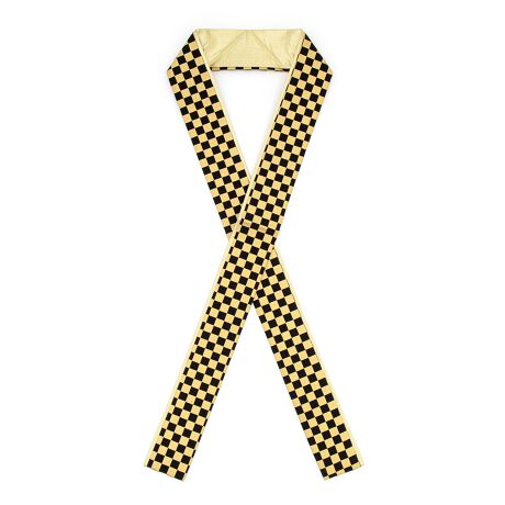 シンプルな市松格子の意匠で、裏面は金色の無地のリバーシブルとなっており、衿の見せ方を替えて四通りの使い方ができます。