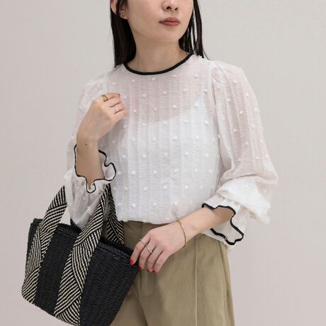 ・ギャザーの入ったふんわりとした袖や軽やかな素材感で一枚で春らしい着こなしが完成